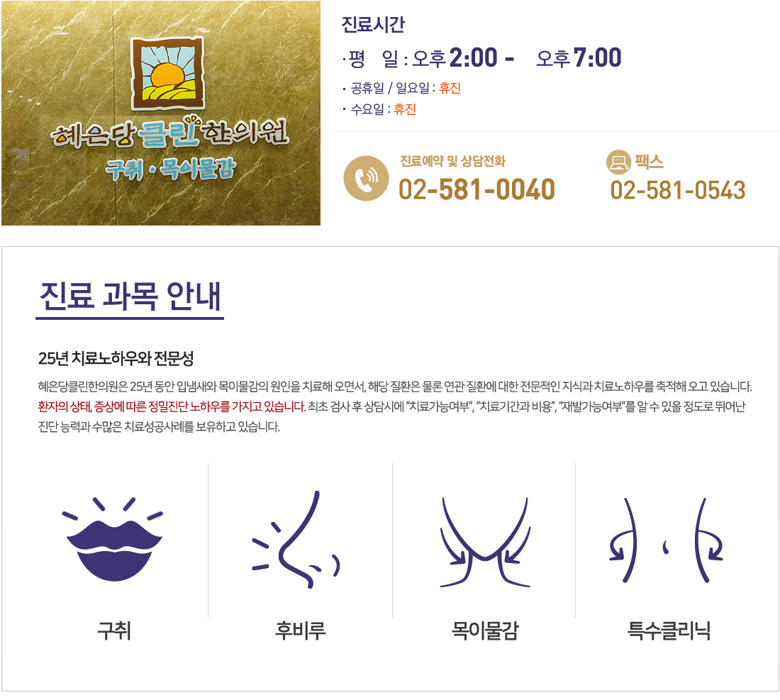 입냄새,후비루,목이물감,역류성식도염,비염,축농증,치질,소화기질환 등의 치료를 위해 혜은당클린한의원은 정성을 다합니다.